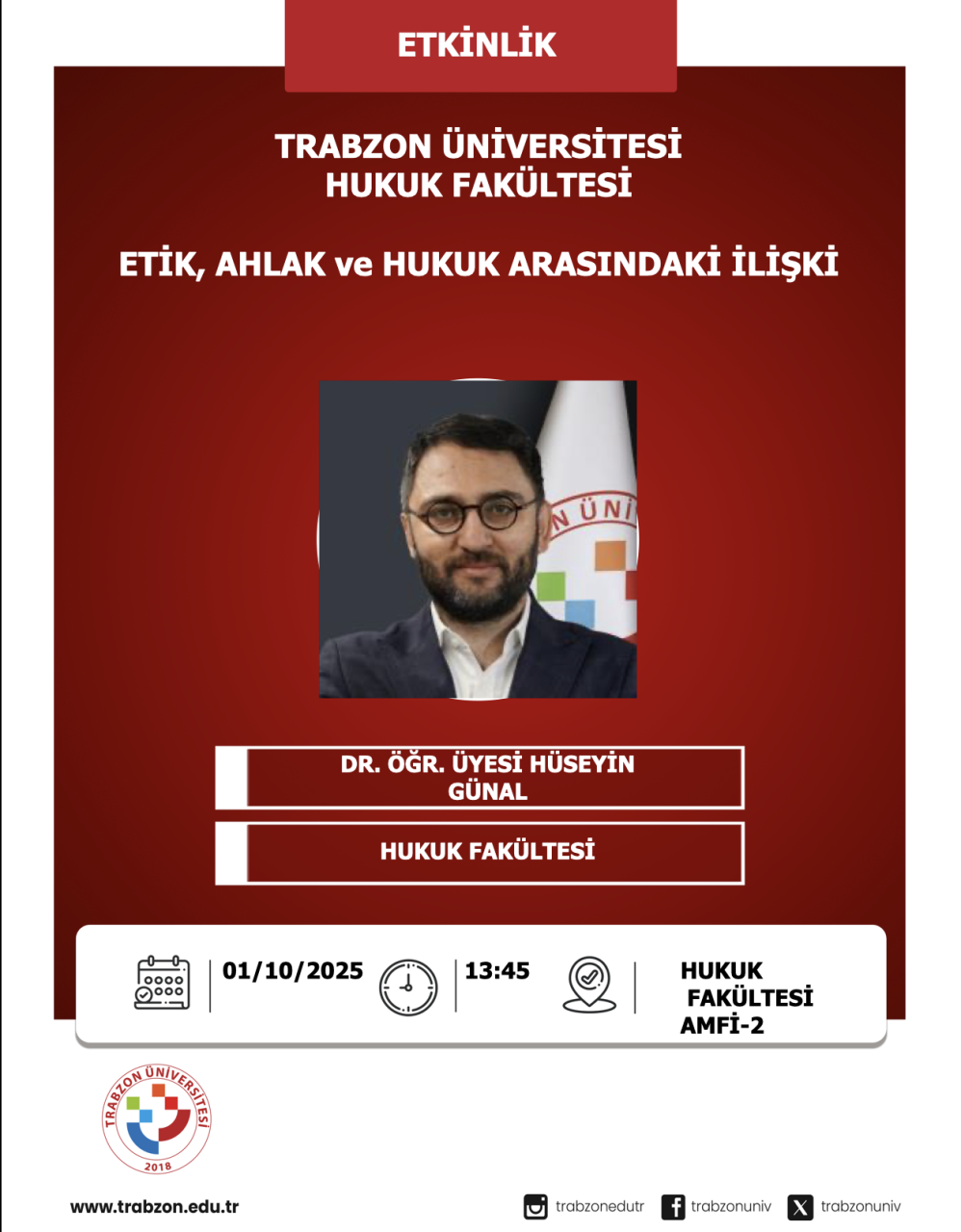 1 Ekim 2025 Çarşamba günü saat 13.45'te Dr. Öğr. Üyesi Hüseyin Günal tarafından "Etik, Ahlak ve Hukuk Arasındaki İlişki" konulu seminer gerçekleştirilecektir.