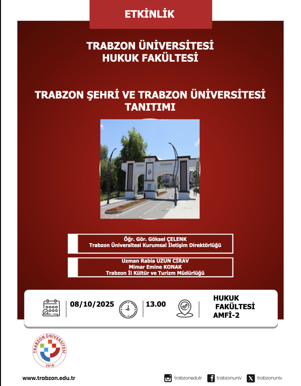 8 Ekim 2025 Çarşamba günü saat 13.00'te Trabzon Üniversitesi Kurumsal İletişim Direktörlüğünden Öğr. Gör. Göksel Çelenk, Trabzon İl Kültür ve Turizm Müdürlüğünden Uzman Rabia Uzun Cirav ve Mimar Emine Konak tarafından Trabzon Şehri ve Trabzon Üniversitesi Tanıtımı konulu seminer gerçekleştirilecektir.