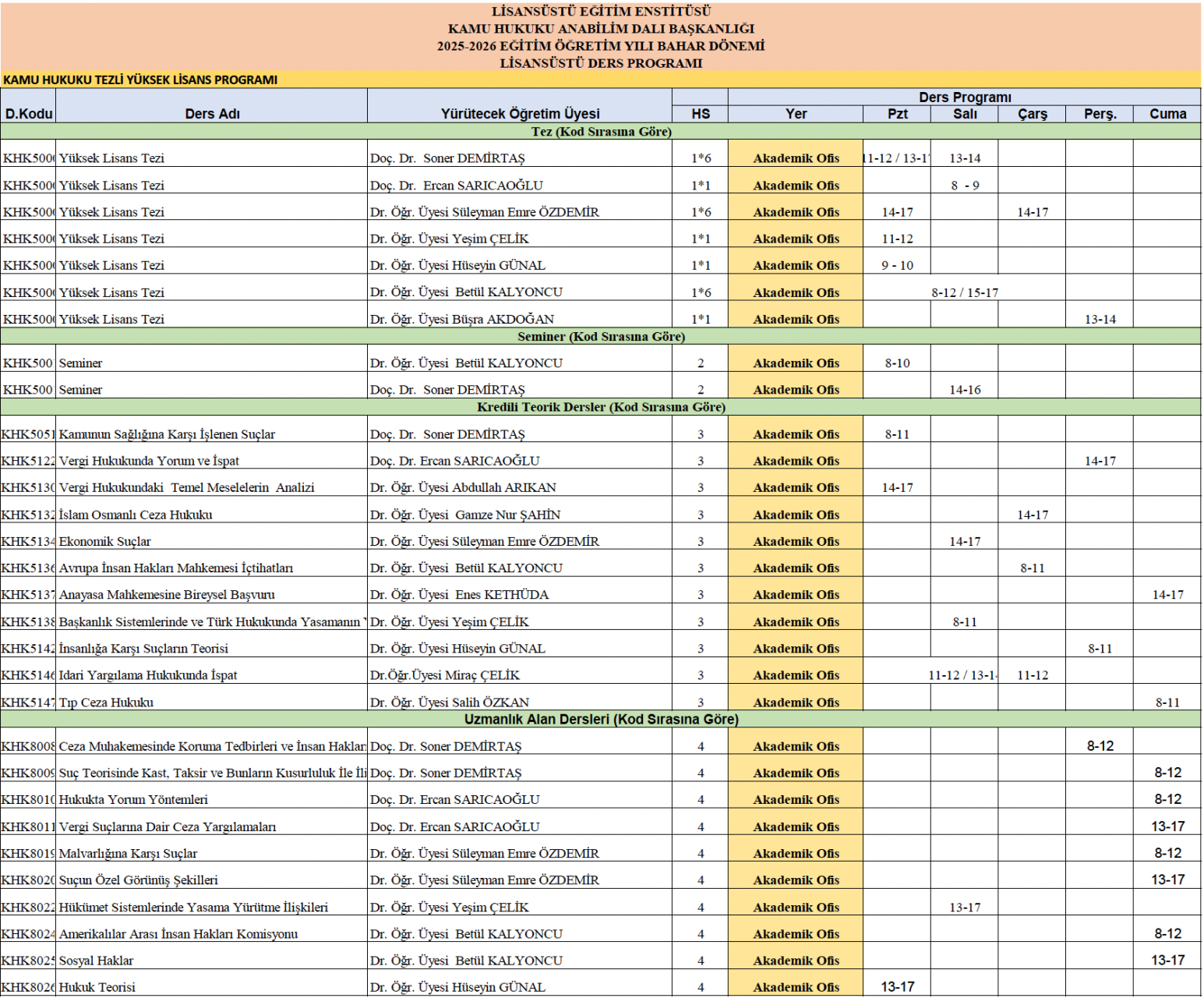 2025–2026 Eğitim Öğretim Yılı Bahar Yarıyılı Kamu Hukuku Tezli Yüksek Lisans Ders Programı