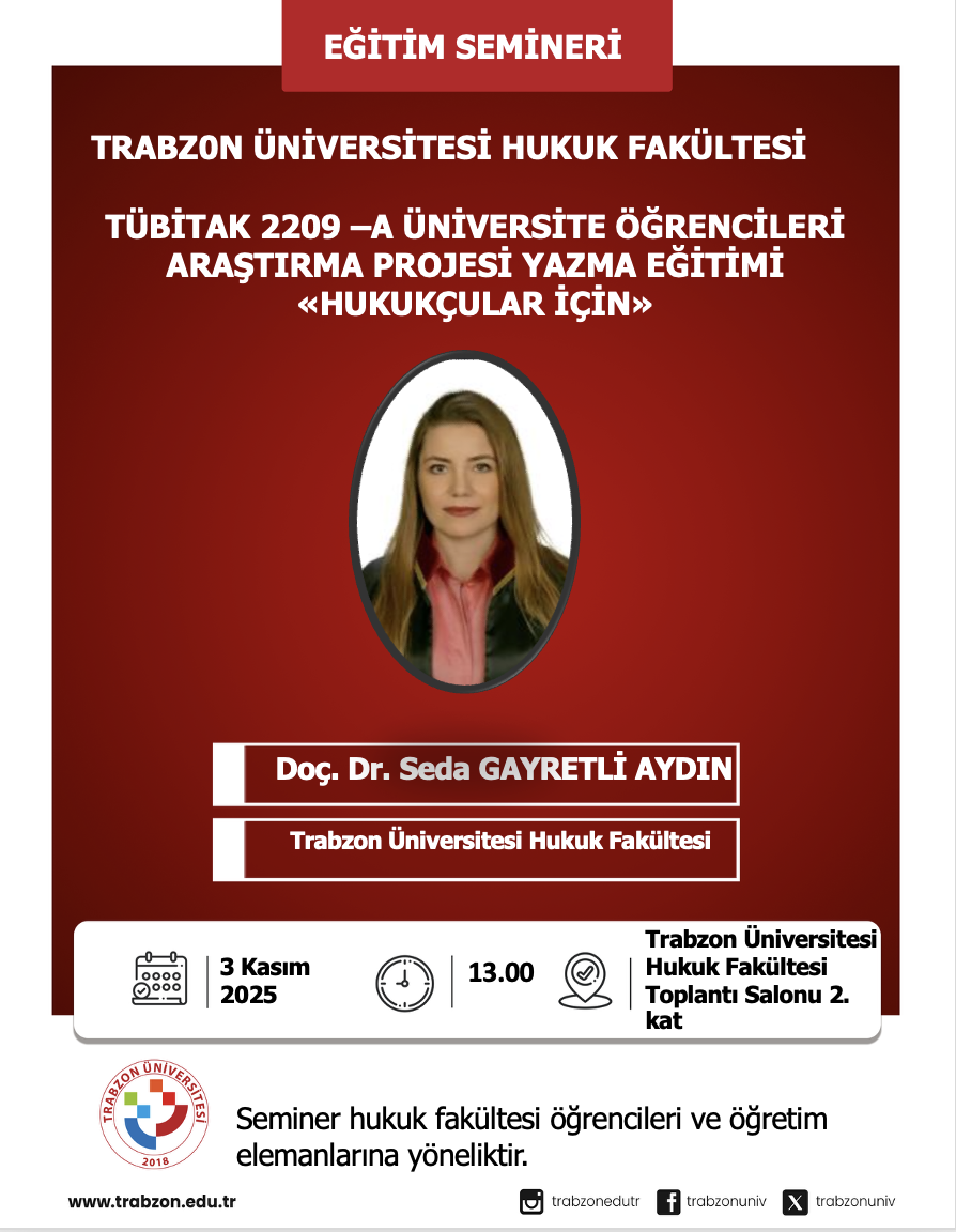 3 Kasım 2025 Pazartesi günü saat 13.00'te Trabzon Üniversitesi Hukuk Fakültesi Medeni Hukuk Anabilim Dalı Öğretim Üyesi Doç. Dr. Seda GAYRETLİ AYDIN tarafından “Tübitak 2209-A Üniversite Öğrencileri Araştırma Projesi Yazma Eğitimi” konulu seminer gerçekleştirilecektir.