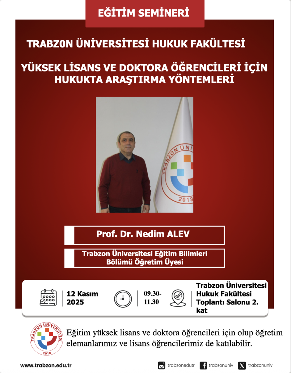 12 Kasım 2025 Çarşamba günü saat 09.30'da Hukuk Fakültesi Toplantı Salonunda Prof. Dr. Nedim ALEV tarafından "Yüksek Lisans ve Doktora Öğrencilerİ İçin Hukukta Araştırma Yöntemleri" başlıklı seminer gerçekleştirilecektir.