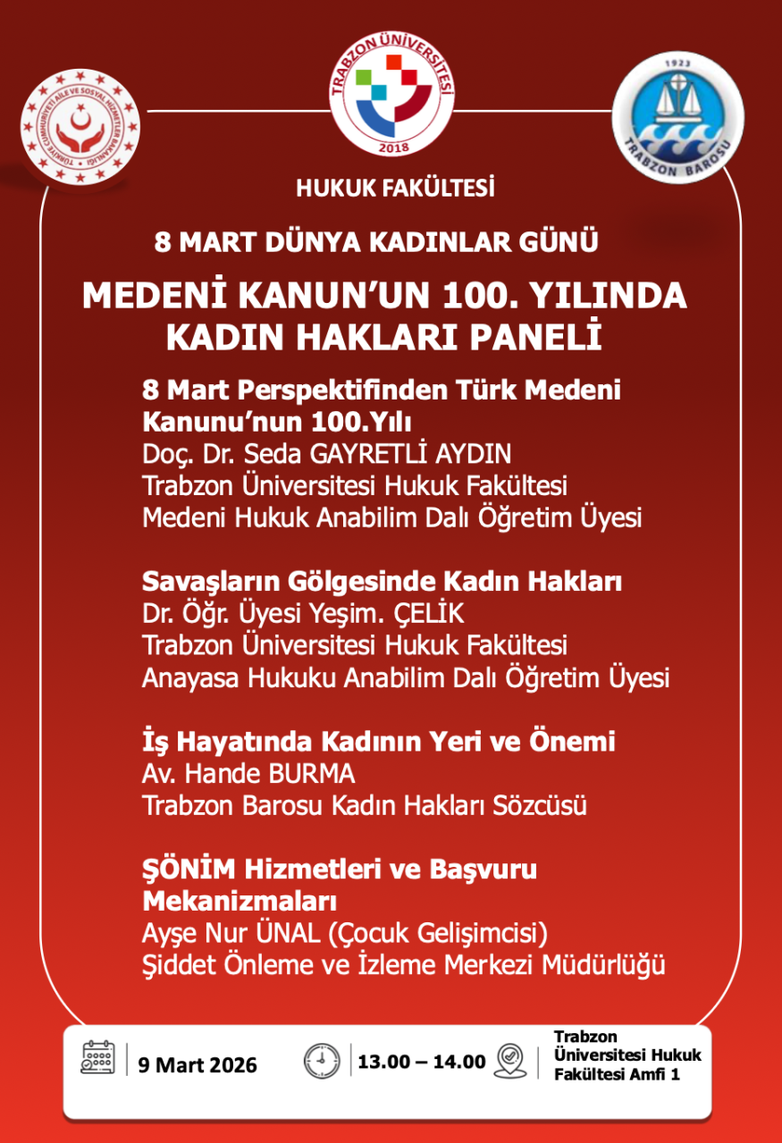 9 Mart 2026 tarihinde Hukuk Fakültesi 2. Kat Toplanstı Salonunda "Medeni Kanun'un 100. Yılında Kadın Hakları Paneli" gerçekleştirilecektir.