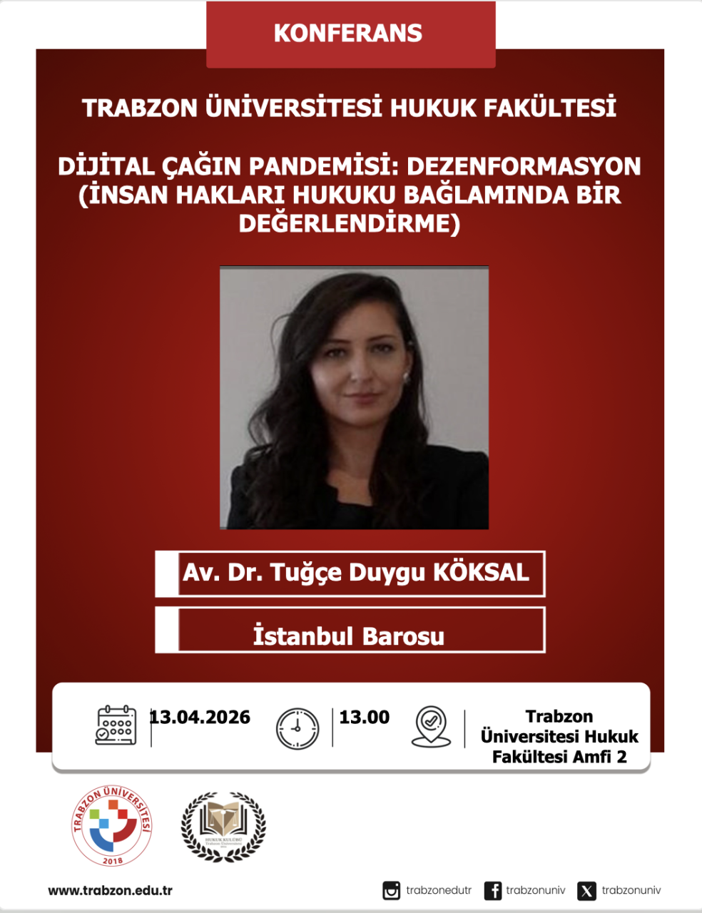 13 Nisan 2026 tarihinde Hukuk Fakültesi Amfi-2'de Av. Dr. Tuğçe Duygu KÖKSAL tarafından "Dijital Çağın Pandemisi:Dezenformasyon (İnsan Hakları Hukuku Bağlamında Bir Değerlendirme)" başlıklı konferans gerçekleştirilecektir.