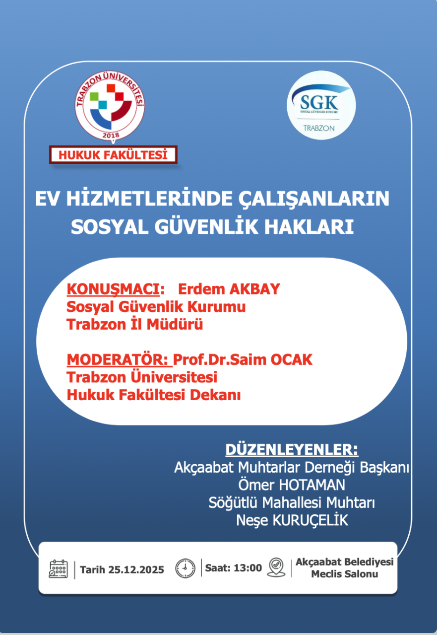 25 Aralık 2025 tarihinde Trabzon Üniversitesi Hukuk Fakültesi ve Sosyal Güvenlik Kurumu Trabzon İl Müdürlüğü işbirliği ile "Ev Hizmetlerinde Çalışanların Sosyal Güvenlik Hakları" konulu seminer gerçekleştirilmiştir.