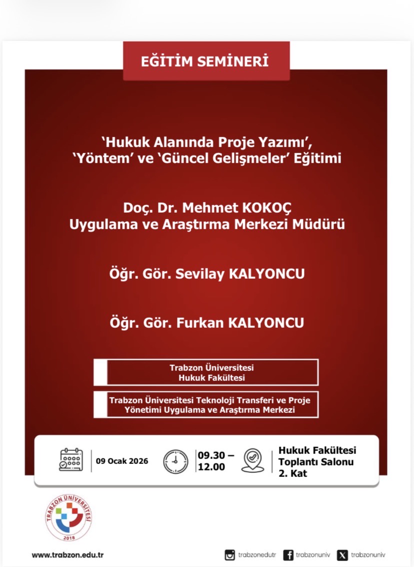 9 Ocak 2026 tarihinde Doç. Dr. Mehmet KOKOÇ, Öğr. Gör. Sevilay KALYONCU ve Öğr. Gör. Furkan KALYONCU tarafında akademik personelimize yönelik "Hukuk Alanında Proje Yazımı", "Yöntem" ve "Güncel Gelişmeler" eğitimi verilmiştir.