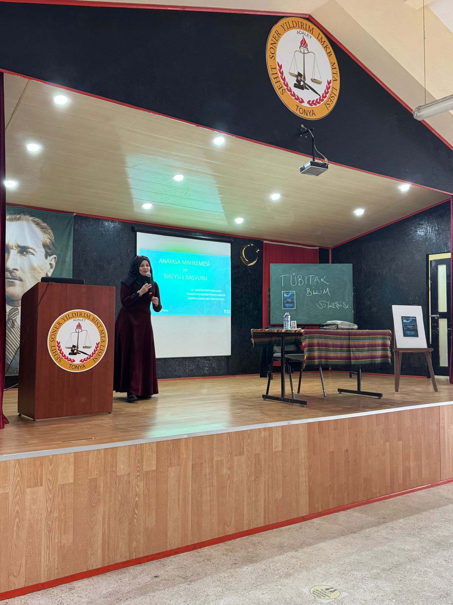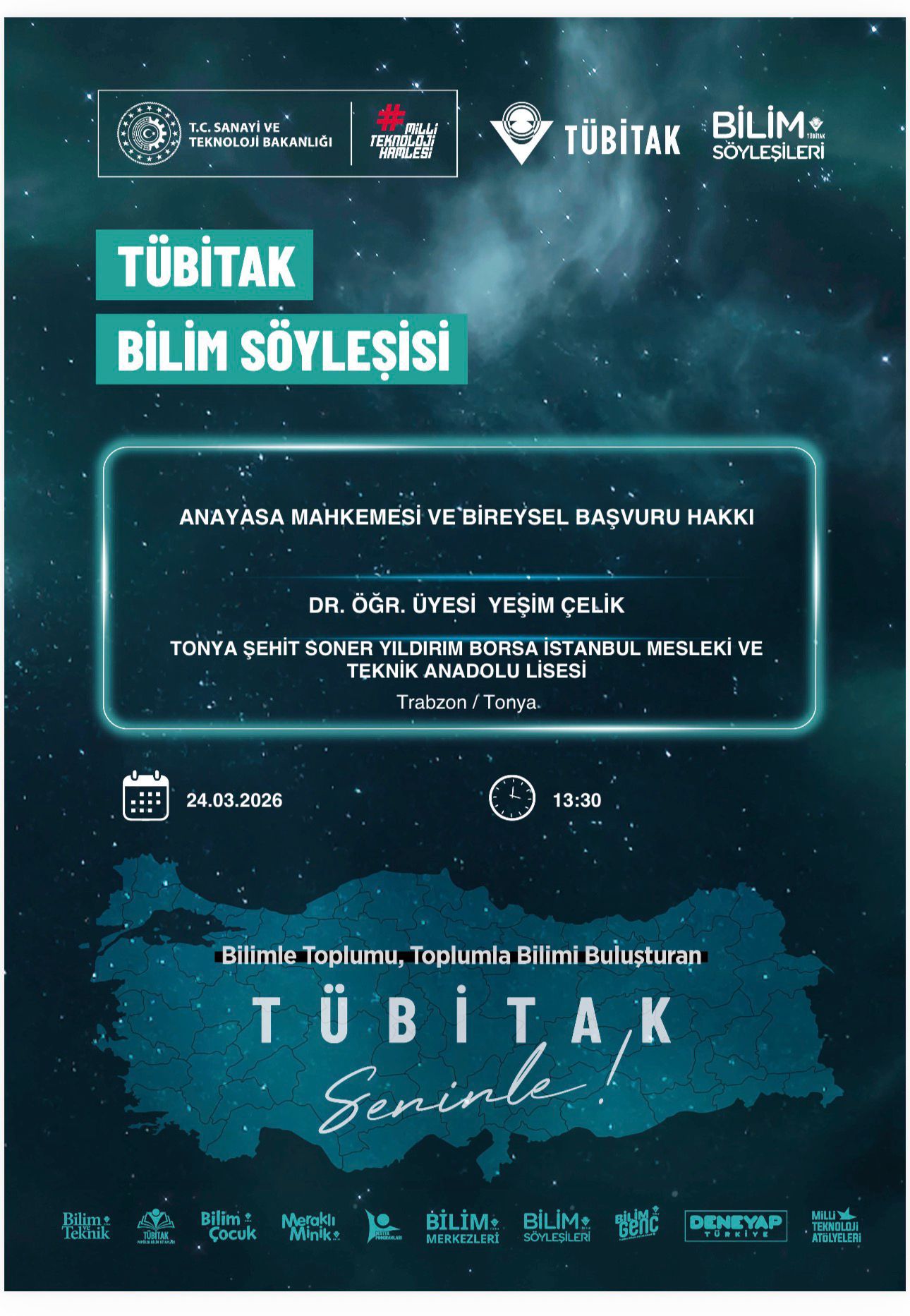 24 Mart 2026 tarihinde Fakültemiz öğretim üyelerinden Dr. Öğretim Üyesi Yeşim Çelik tarafından Tübitak Bilim Söyleşileri kapsamında Tonya Şehit Soner Yıldırım Borsa İstanbul Mesleki ve Teknik Anadolu Lisesi’nde “Anayasa Mahkemesi ve Bireysel Başvuru Hakkı” başlıklı sunum gerçekleştirmiştir.